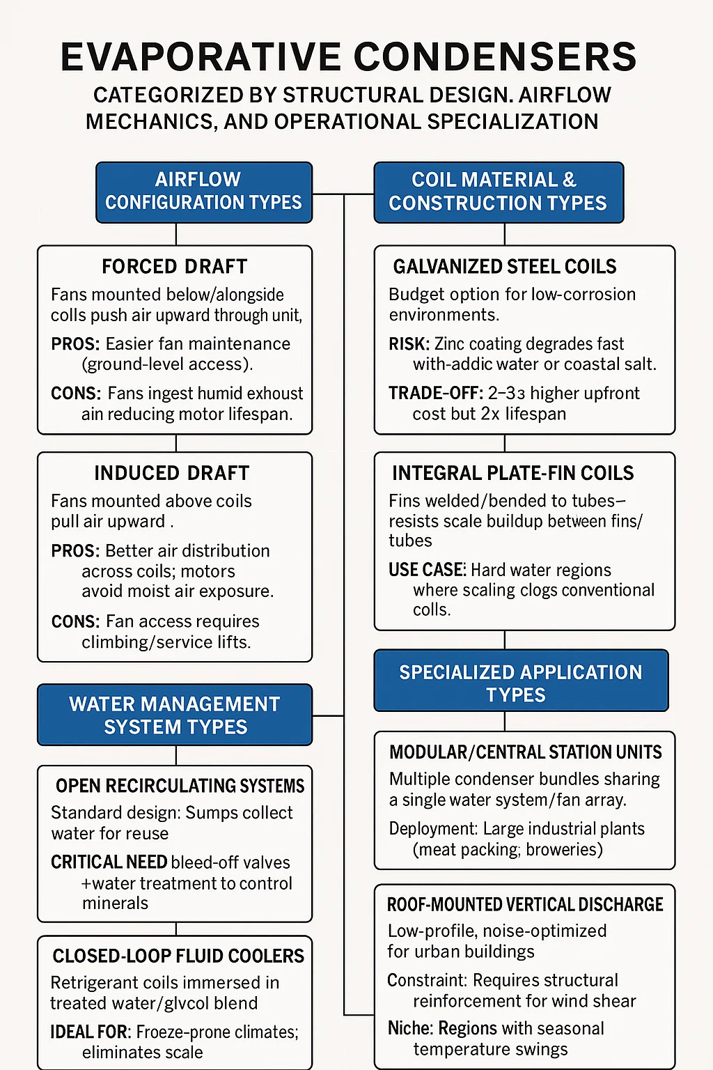 Párolgási kondenzátorok szerkezeti tervezés, légáramlás mechanika és működési specializáció szerint vannak besorolva. Az alábbiakban a gyakori típusok mezőközpontú lebontása látható: